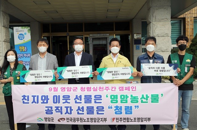 이날 행사는 추석명절을 앞두고 공직자의 ‘선물 안 주고 안 받기’ 실천을 다짐하면서 공직 내부의 청렴 문화를 확산하고자 하는 홍보활동의 일환으로 전국공무원노조 영암군지부와 민주연합노조 영암지부가 함께 참여했다.