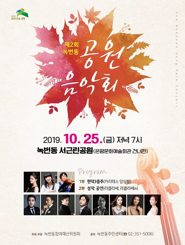 김윤식 녹번동장은 “올 봄 벚꽃이 흩날리던 무대 위의 여운이 아직도 생생한데 어느덧 낙엽지는 가을이 되었다.”며 “아름다운 계절에 문화 공연을 통해 바쁜 일상 속 가족과 함께하는 소중한 시간도 만들고 마음충전도 하시길 바란다.”고 전했다.