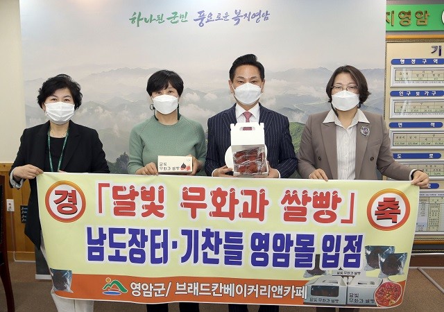 | ▲ 전동평 영암군수(우측 두 번쨰)가 영암군 관광상품으로 개발한 '달빛 무화과 쌀방' 남도장터 기찬들 영암몰 입점을 기념해 군 관계자 및 브래드베이커리 관계자와 함께 선물용 달빛 무화과 쌀방을 소개하고 있다. / 사진=영암군 제공 |