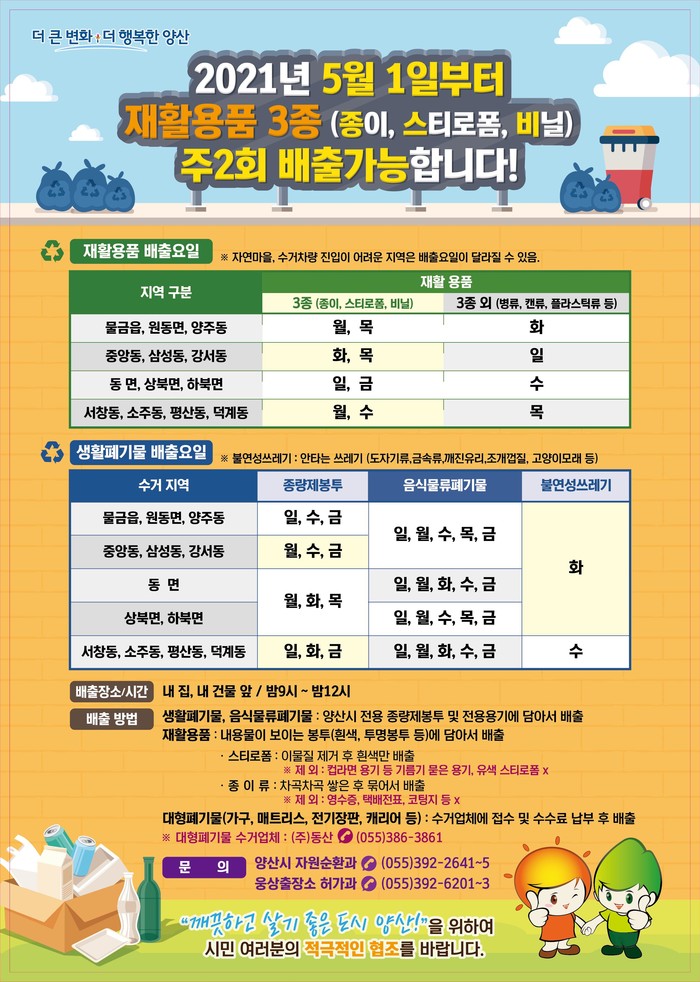 양산시 관계자는 “이번 제도 개선에 맞추어 그동안 지역별로 각각 다른 음식물쓰레기 배출요일을 2종으로 통일하여 종전과 같이 주5회 수거하며, 이같이 변경된 생활폐기물 배출일정을 앞으로 두달간 집중적으로 홍보하여 시민들이 혼란을 겪지 않도록 할 계획이며, 특히 시민들이 재활용품을 배출하실 때 ‘종이, 스티로폼, 비닐’의 첫 글자를 딴‘종ㆍ스ㆍ비’세음절만 기억한다면 배출일정을 혼돈하지 않고 쉽게 배출할 수 있을 것이라며 “종ㆍ스ㆍ비”를 꼭 기억해 줄 것을 당부드린다” 고 말했다.