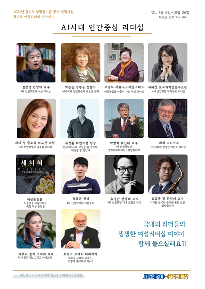경기도여성리더십아카데미에서 주최하고 웨스트민스터 신학대학원대학교(총장 정인찬. 이하 웨신대), 거꾸로미디어연구소, 미래교육플랫폼에서 공동 주관하는 16주간의 특별 강의 및 나눔의 시리즈는 ‘포용과 협력으로 나와 타인을 변화시켜 함께 성장하는 사회를 만드는 인간중심의 여성 리더십'을 세우게 된다.
