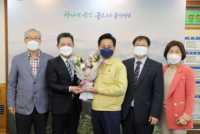 | ▲ 전동평 영암군수(좌로부터 3번 째), 전남 사회복지 공동모금회 감사패 전수 / 사진= 영암군 제공 |