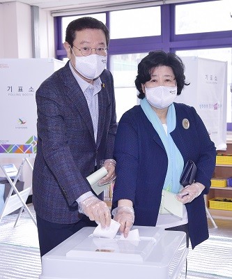 [광주=정찬남 기자] 이용섭 광주광역시장이 제21대 국회의원 선거 투표일인 15일 오전 서구 화개초등학교에 마련된 금호2동 제1투표소에서 부인 신영옥 여사와 함께 투표를 하고 있다.(사진제공=광주광역시)