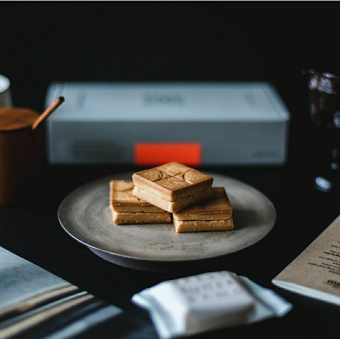 일본 도쿄에서 줄 서서 먹는 구움과자 가게 ‘프레스버터샌드’는 버터크림과 버터 캐러멜 필링을 채워 특수 공법으로 구운 과자이다. 특유의 바삭함과 버터의 풍미가 특징이다. 건축학에서 영감을 받은 쿠키 모양과 패키지 디자인에서 일본 특유의 감성을 느낄 수 있다.