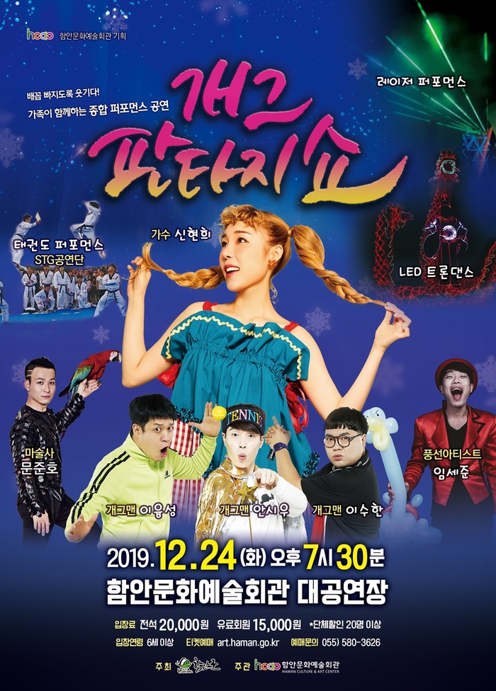 함안군은 오는 24일 저녁 7시 30분 함안문화예술회관 대공연장에서 각 장르별 최고의 퍼포먼스 아티스트들과 개그맨을 한자리에 모아 온가족이 함께 즐길 수 있는 ‘개그 판타지 쇼’ 공연이 펼쳐진다.