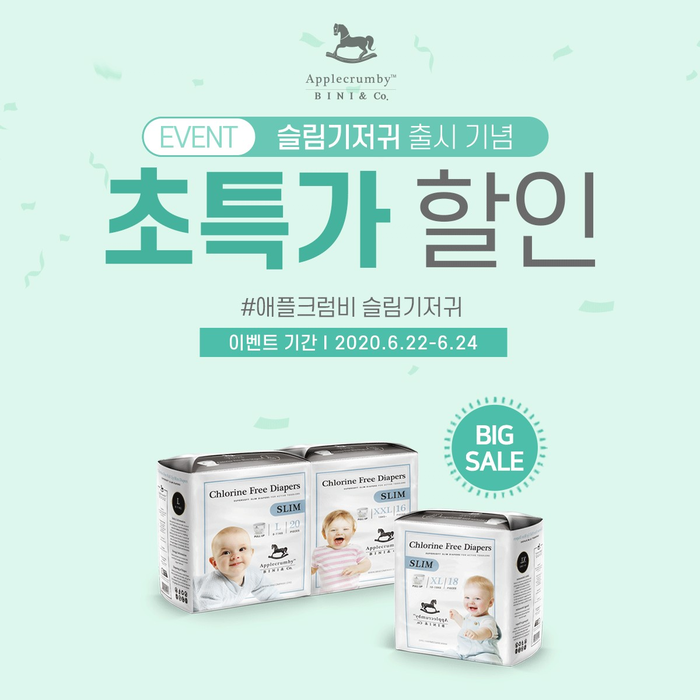 비니앤컴퍼니의 친환경 프리미엄기저귀 브랜드 애플크럼비가 슬림기저귀 출시를 기념해 초특가 할인 이벤트를 진행한다. 신제품 슬림기저귀는 얇은 두께로 통기성을 향상시킨 애플크럼비 여름 기저귀다. 기존의 우수한 흡수력과 보송한 감촉은 그대로 살렸다.