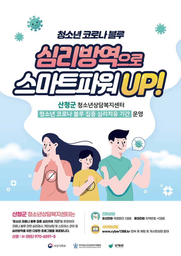산청군이 지역 청소년들의 ‘코로나블루’를 해소하기 위해 오는 31일까지 ‘집중 심리치유기간’을 운영한다고 6일 밝혔다.