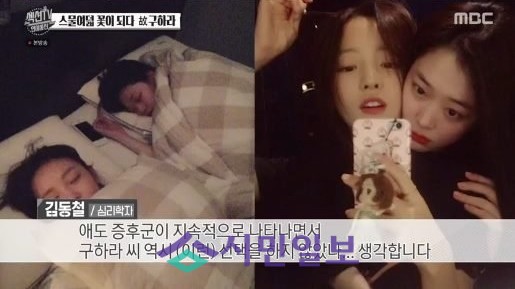 하지만 구하라는 고 설리가 떠난 지 42일 만에 숨을 거뒀다. 심리학자는 "5월에 (SNS에) '안녕'을 올리고 안 좋은 행동을 했다. 그 이후에 염려한 분이 많았다. (사망) 이전에도 '잘자'라는 글을 (SNS에) 올렸다"고 짚으며 "지속적인 악플 때문에 우울증이 심했을 거고, 우울증 증상이 높으면 스스로 생각이 협소해지고 부정적으로 변화하기 때문에 안 좋은 행을 했을 거다"고 말했다.