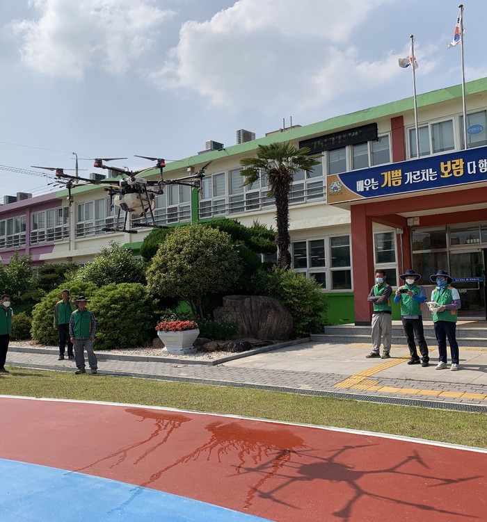 이번에는 농업 방제의 노하우를 살려 인력으로 하기 힘든 학교 운동장 소독을 농업용 드론을 이용해 보다 쉽고 효율적으로 실시해 학생들의 안전 등교에 힘을 보탰다.