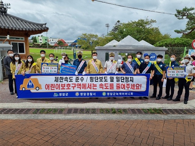 | ▲ 영암군, 유관기관 -사회단체와 초등학교 2학기 개학기 맞이 "어린이 보호구역 차량 속도 줄이기" 교통안전 캠페인 실시 / 사진=영암군 제공 |