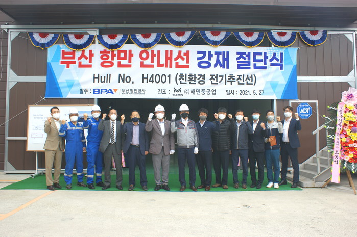 부산항만공사(BPA, 사장 남기찬)가 내년에 국내 최초로 도입할 전기추진 항만안내선을 건조하기 위해 지난 27일, ㈜해민중공업에서 강재절단식을 개최했다고 밝혔다.