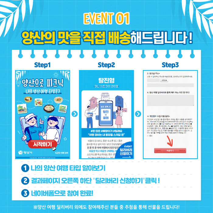 양산시 SNS를 통해 ‘양산 여행 타입 테스트’ 참여 후에 ‘양산여행 딜리버리’이벤트를 신청할 수 있으며, 추첨을 통해 양산의 대표 음식 배송 또는 캄포도마, 피크닉 폴딩박스, 피크닉 랜턴, 피크닉 매트 등을 증정한다.