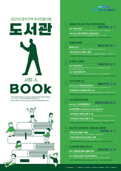 이번 ‘도서관·人·Book’ 행사 참가 신청 일정 등은 광주시 대표도서관 홈페이지 독서진흥행사의 ‘도서관‧인‧Book’ 또는 각 운영 도서관 홈페이지에서 확인한 후 접수하면 된다.