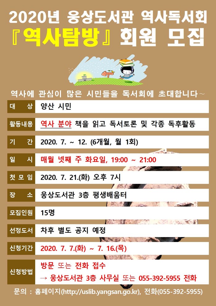 역사독서회는 매월 넷째 주 화요일 오후 7시부터 9시까지 웅상도서관 3층 평생배움터에서 월 1회 진행된다. 첫 모임은 7월 21일(화) 오후 7시에 열릴 예정이며, 양산시민이면 누구든지 자유롭게 회원 신청을 할 수 있다.