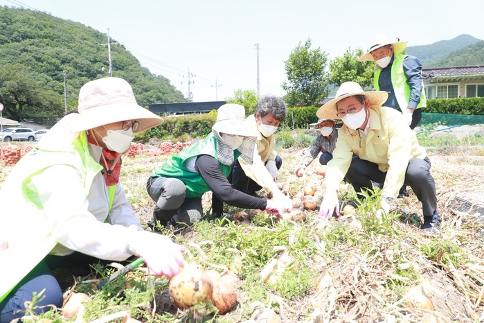 이날 회원들은 코로나19로 인해 일손이 더욱 부족해진 농가를 돕고자 자발적으로 참여해 이른 아침부터 양파 수확 봉사활동에 구슬땀을 흘렸다.