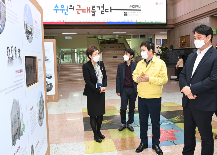 ▲ 염태영 수원시장(왼쪽 세 번째)이 수원시청 로비에서 진행된 ‘수원의 근대를 걷다’ 순회전시에서 전시물을 둘러보고 있다. (사진제공=수원시청) |