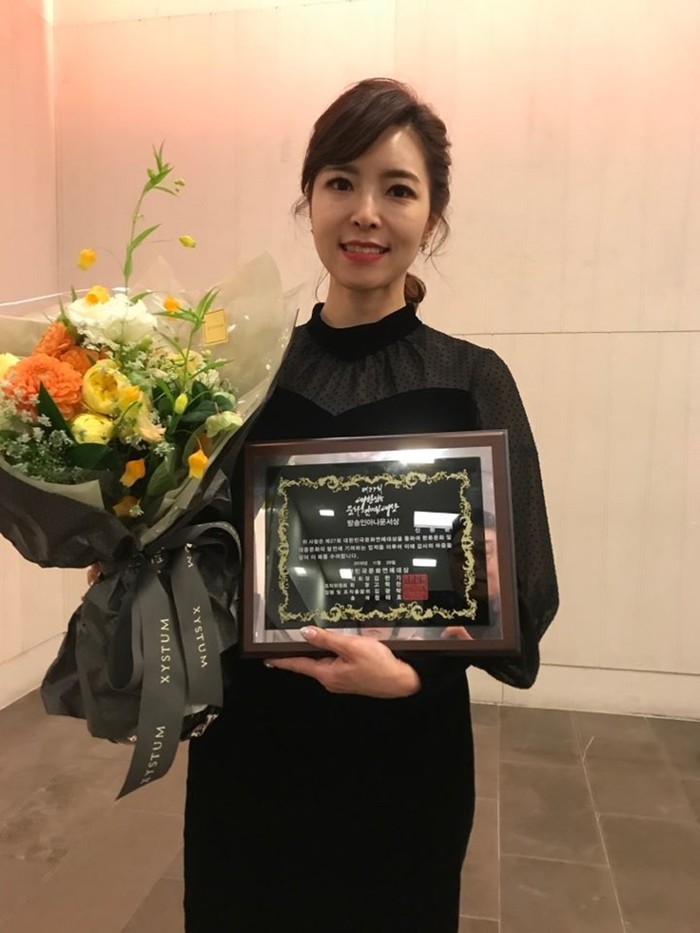 | 아나운서 신동윤이 수상 후 기념촬영을 하고 있다. |