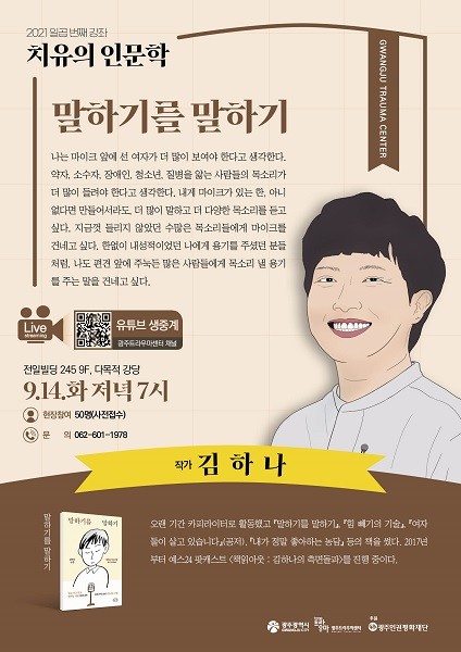 치유의 인문학은 코로나19 사회적 거리두기에 따라 현장 인원을 50명 이내로 제한하며, 유튜브 채널 ‘광주트라우마센터’로도 생중계된다. 자세한 강연 내용은 광주트라우마센터 홈페이지의 ‘활동과 소식’에서 확인할 수 있다.