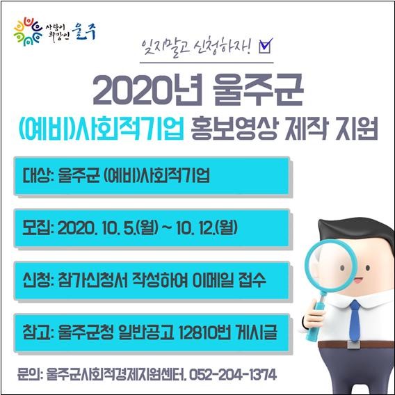 또한 2020년 울주군 (예비)사회적기업 홍보영상 제작 지원사업은 홍보 전담자를 따로 두기 어려운 영세한 사회적경제기업의 상황을 고려해 기업 영상의 컨셉 설정 및 시나리오 작성도 지원된다.