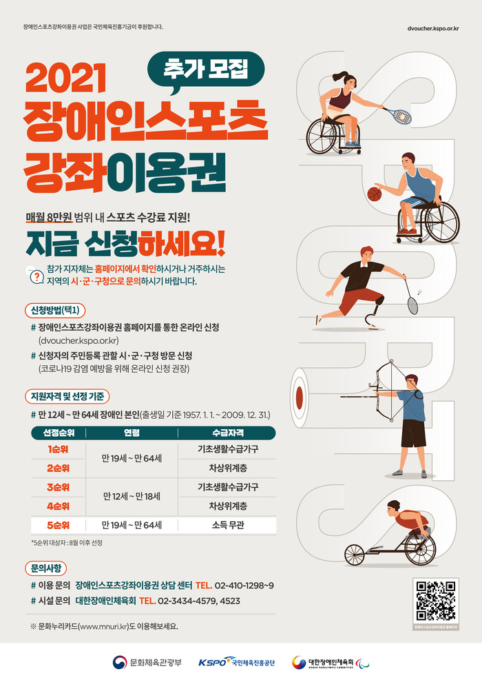 이에 따라 시는 6일부터 13일까지 지원 대상을 확대한 2021년도 장애인 스포츠강좌이용권 지원사업의 지원 희망자를 추가 모집한다.