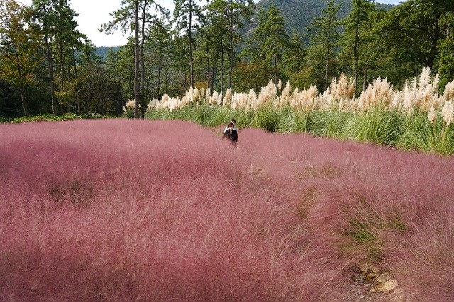 분홍억새라고도 불리는 핑크뮬리는 가을에 분홍과 자주색의 꽃을 피우는데 일명 인생샷을 만드는 사진 배경으로 각광받고 있다.