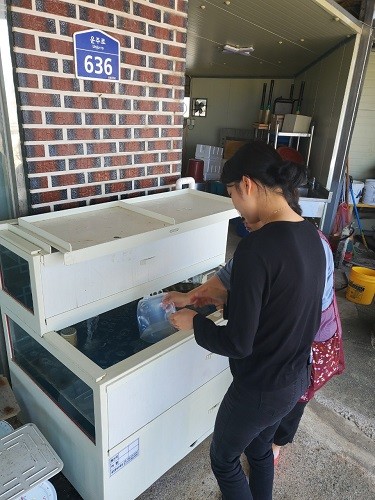 | ▲ 강진군보건소 담당자, 강진군 내 식당의 수족관수 채취 / 사진=강진군 제공 |