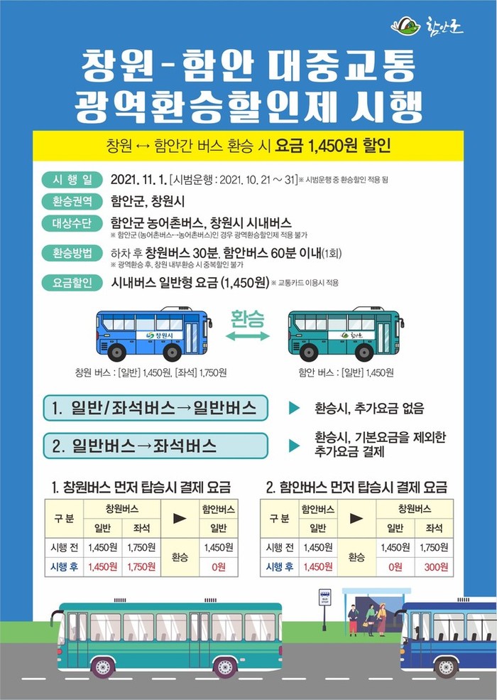 한편, 함안군은 지난 5월 25일 창원시와 광역 환승할인제 도입에 따른 업무협약 체결로 사업비 3억여 원을 투입해 6월부터 4개월간 관련 시스템을 개발했다.