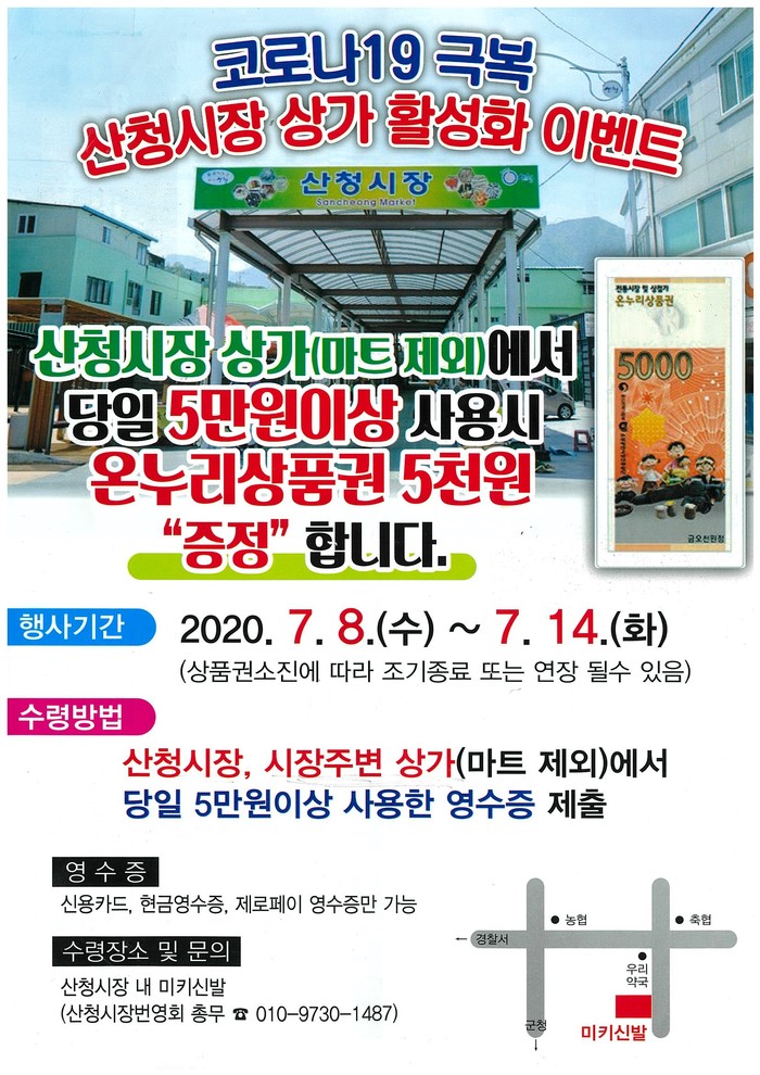 업종 구분 없이 식당, 이미용업, 도소매업 등 산청시장과 주변상가를 이용한 소비자라면 당일 합산 5만원 이상 영수증을 제출하면 온누리상품권 5000원을 되돌려 준다. 단 농협·대형마트는 대상에서 제외된다.