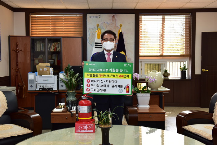 [창녕=최성일 기자] 이칠봉 경남 창녕군의회 의장이 지난 9일 김상욱 창녕소방서장의 지명을 받아 ‘119 릴레이 챌린지’에 참여했다.