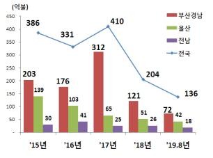 부산본부세관(세관장 제영광)에서 발표한 ‘부산‧경남지역 선박 수출동향 분석’ 자료에 따르면, 부산‧경남지역의 올해 8월까지 선박 수출은 지난해 같은 기간보다 1.2% 증가한 72억 3천만불로 위기에 있던 조선업이 완만한 회복세를 보이고 있는 것으로 나타났다.