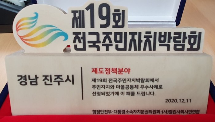 진주시는‘제19회 전국 주민자치 박람회’우수사례 공모전 제도정책 분야에 우수상을 수상하여 특별교부세 2500만원을 확보했다.