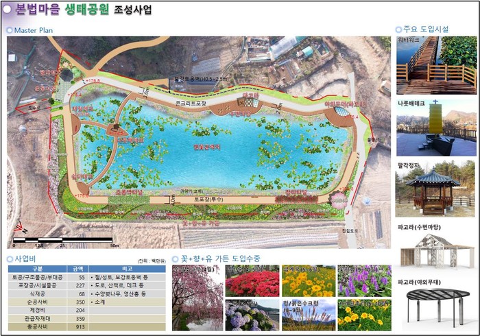특히 본법마을 생태공원 조성사업은 총 10억 원을 투입하여, 법기수원지 인근의 소류지를 활용해 산책로 및 생태공원을 조성하는 사업으로, 법기수원지와 연계하여 방문객 증가로 인해 지역경제 활성화도 기대된다.