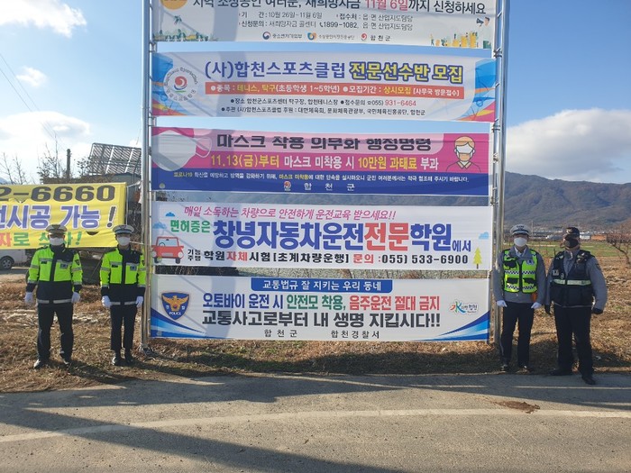 최근 도내 오토바이, 보행자, 음주운전 교통사고가 지속 발생하고 있어, 2020. 11. 20부터 합천군 17개 읍,면사무소와 협치로 국민생명지키기 교통안전활동의 일환으로 「교통법규 잘지키는 우리동네, 오토바이운행시 안전모 착용, 음주운전 절대금지, 교통사고로부터 내생명 지킵시다」문구
