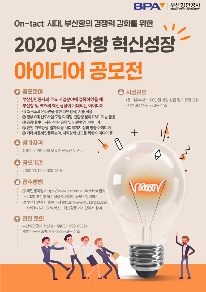 부산 항만공사(BPA, 사장 남기찬)는 코로나19 이후 뉴 노멀 시대를 맞이하여 국민과 함께 부산항의 미래를 능동적으로 준비하고자 지난 12일(목)부터 12월 10일(목)까지 ‘2020 부산항 혁신성장 아이디어 공모전’을 시행한다고 밝혔다.
