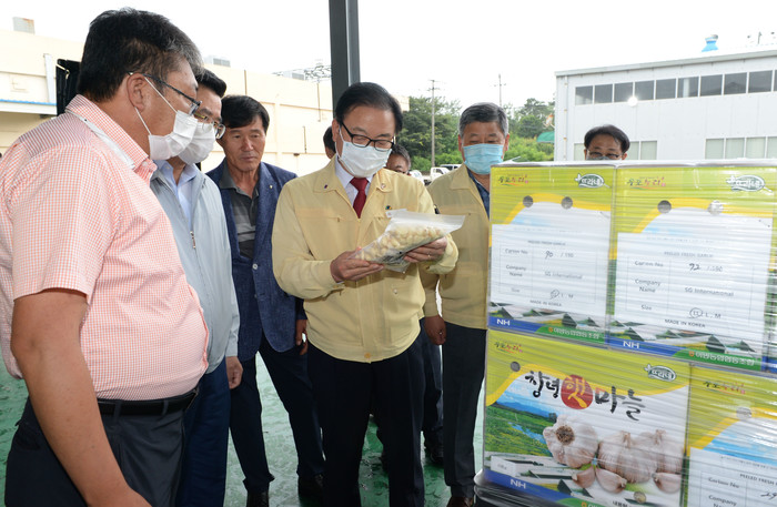 | 한정우 군수가 창녕산 깐마늘을 보고 있다. |