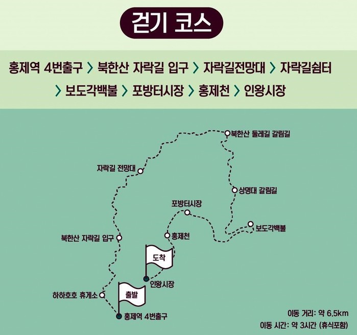 1차 서대문 코스(6.5km)는 홍제역에서부터 북한산 자락길 전망대, 포방터시장, 홍제천을 거쳐 인왕시장까지 이어진다. 2차 마포 코스(6.5km)는 독립문역에서 안산자락길, 아현동 벽화골목, 공덕시장으로, 3차 은평 코스(7.0km)는 불광역에서 은평둘레길, 백련산 전망대, 대림시장으로 이어진다.