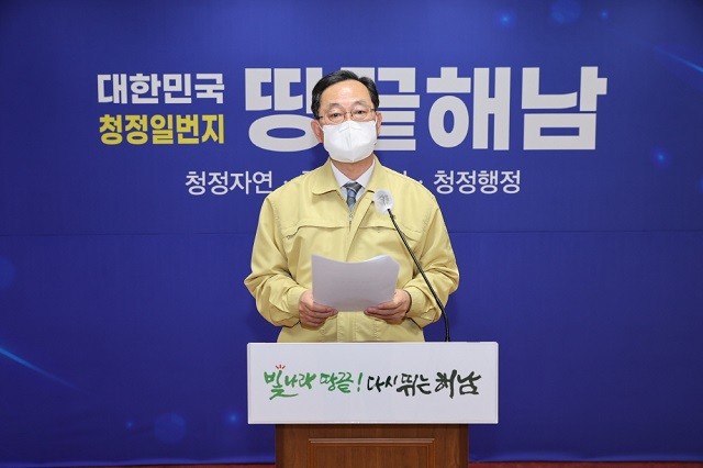 명현관 해남군수는 24일 긴급 브리핑을 갖고, 호소문을 통해 “설 연휴 이후 전남지역에서 산발적인 감염이 지속되면서 우려가 커지고 있다”며 “군민 여러분께서도 타 지역 방문과 외출, 모임 자제 등 이동을 최소화하고, 의심 증상이 있을 경우 신속하게 검사를 받아 대규모 확산을 조기에 차단하는 노력에 동참해 주시길 바란다.”고 밝혔다.