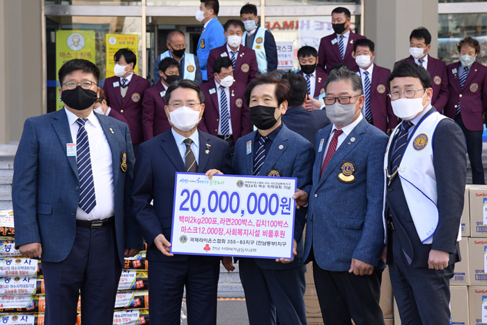 국제라이온스협회 355-B3(전남동부)지구 여수 1.2.3지역 회원들이 코로나19로 지역대회를 취소하고 어려운 이웃을 위해 2000만 원 상당의 후원물품을 여수시에 전달했다.