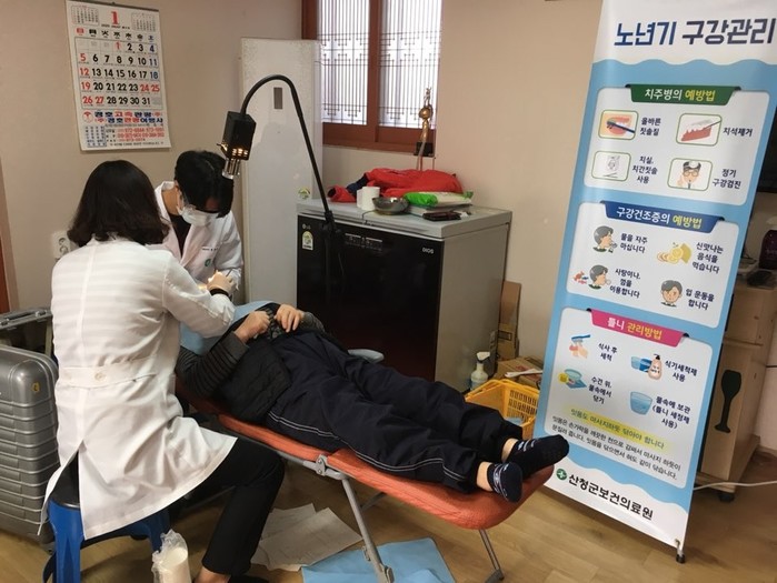 산청군보건의료원이 의료취약지역 마을의 경로당을 직접 찾아 통합 구강보건 의료서비스를 펼친다.