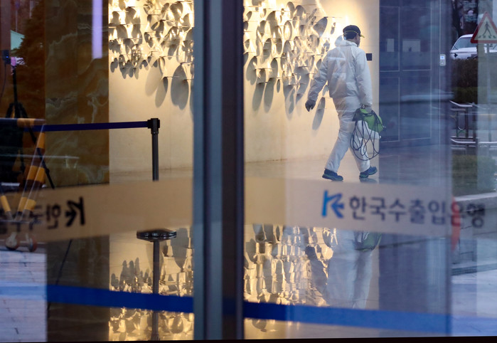 | 28일 서울 영등포구 여의도 수출입은행 본점에서 방역업체 관계자가 소독을 하고 있다.(사진제공=연합뉴스) |