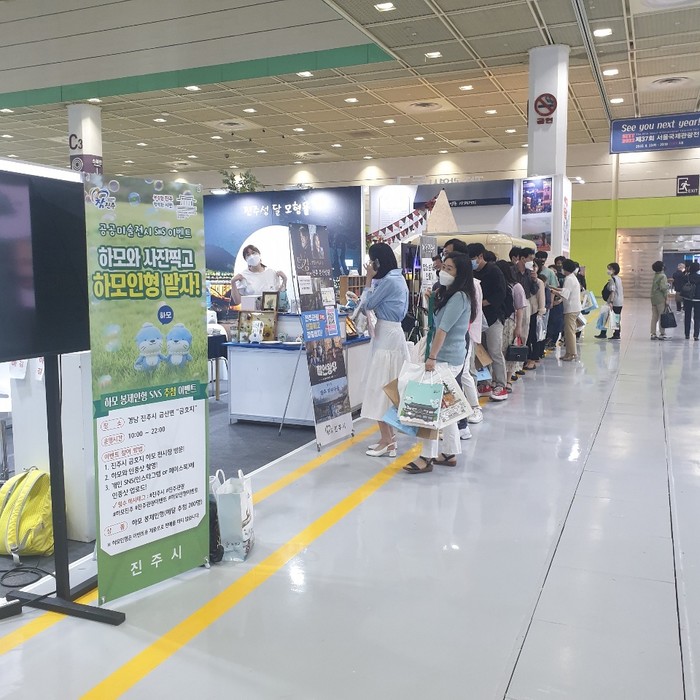 또한, 최근 인기를 끌고 있는 금호지 공공미술 전시품인 ‘하모’캐릭터 전시 전경을 부스 배경에 담아 진주의 아름다운 풍경과 하모 캐릭터를 홍보하고 하모 봉제 인형 추첨 이벤트를 진행하며 방문객들의 참여를 유도해 큰 호응을 얻었다.