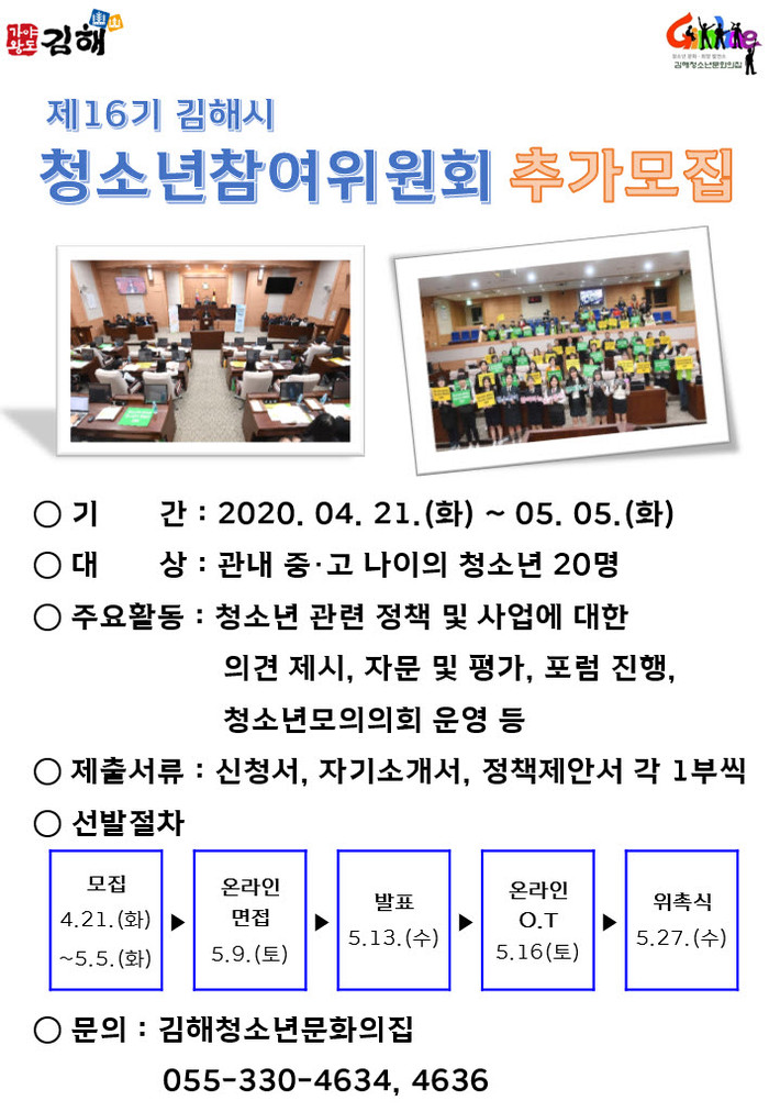 김해청소년문화의집은 청소년 참여기구인 김해시청소년참여위원회 위원 모집을 5월 5일까지 추가로 진행하고 있으며 지원 대상은 관내 중·고등학생 20명 내외다.