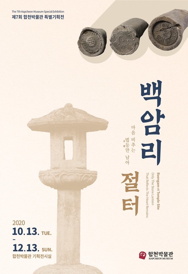 합천박물관은 2020년 10월 13일부터 12월 13일까지 제7회 특별기획전을 개최한다. 이번 특별기획전은 <백암리절터, 마음 비추는 법등만 남아>라는 제목으로 지금은 퇴락하여 절터만 남아 있지만 통일신라시대 합천의 대표적인 사찰의 하나로 조선시대 전반기까지 사세를 유지했던 백암리절터 발굴조사 성과를 알리기 위해 준비했다.