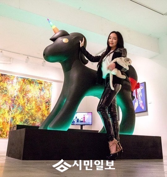 공개된 사진 속에는 고양이 인형을 든 작품 옆에 선 낸시랭의 모습이 담겼다.