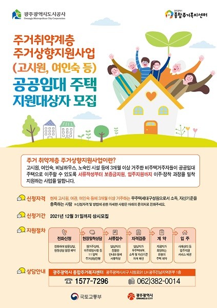 정현윤 시 주택정책과장은 “주거취약계층의 주거안정과 주거상향을 지원할 수 있도록 관련 부서 및 광주종합주거복지센터와 적극 협력해 주거상향지원 대상자를 지속적으로 발굴하겠다.”고 말했다.
