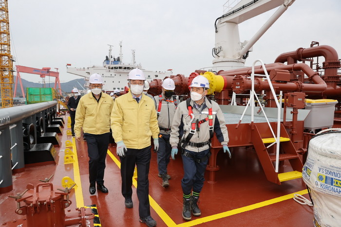 | ▲ 명현관 해남군수(가운데)가 지난 3일 대한조선(주)을 방문해 정대성 대한조선 사장(우측)과 화원산단 조성 현황을 점검하기 위해 건조된 선박을 둘러보고 있다. / 해남군 제공 |