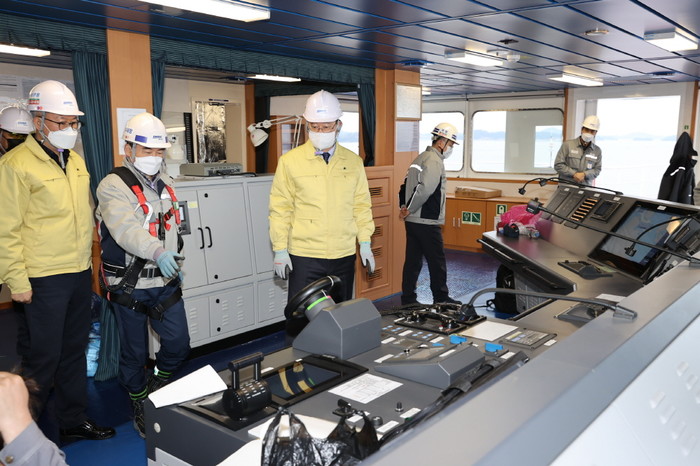 | ▲ 명현관 해남군수(좌측부터 세 번째)가 정대성 대한조선 사장(좌측 두 번째)으로부터 건조된 선박 시설 기능에 대한 설명을 경청하고 있다. / 해남군 제공 |