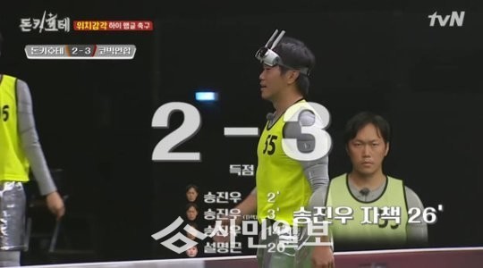 제작진은 "마지막 꿈잣돈 대결은 위치감각을 주제로 한 '하이 앵글 축구'다. 상대로는 연예인 축구단을 모셨다"고 소개했다. 이어 등장한 개그맨 축구단(임검희 미키광수 최성민 김철민 설명근)과 '돈키호테' 멤버들은 하이 앵글 기계를 착용했다.