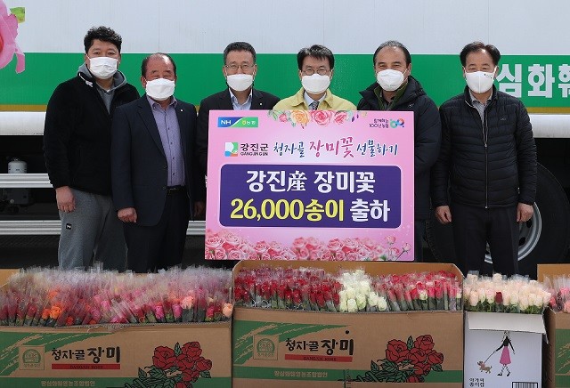 | ▲ 이승옥 강진군수(좌부터 네 번째)가 지난 2월 ‘청자골 장미’ 직거래 출하 현장을 방문해 관계자들과 기념촬영을 하고 있다. / 사진=강진군 제공 |