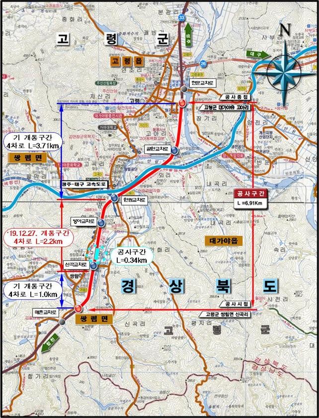 부산지방국토관리청(청장 구헌상)은 “경북 고령군 쌍림면 신곡리에서 고령군 대가야읍 고아리까지 6.9km를 지난 27일 개통함으로서 국도33호선 4차로 신설사업을 마무리”한다고 밝혔다.